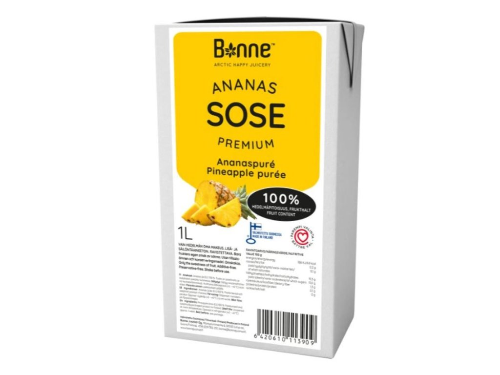 Hledáte dokonalý ananasový vklad do dortu, základ pro zmrzlinu nebo osvěžující náplň do makronek? Toto finské pyré je vyrobeno ze 100% výběrového ananasu a díky šetrné pasterizaci si uchovává svou přirozenou homogenní konzistenci a intenzivní tropickou chuť.