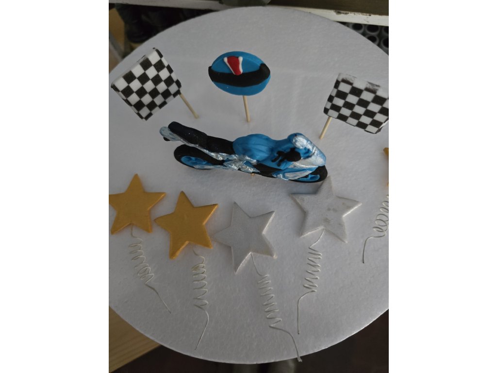 Sada obsahuje 9 pečlivě ručně vyráběných jedlých dekorací z tvrdé cukrové hmoty – motocykl, přilbu, praporky a hvězdy.