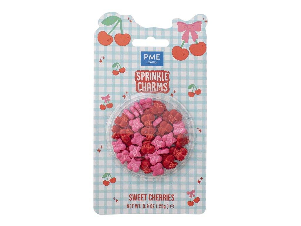 PME Sprinkle Charms s motivem třešní jsou navrženy tak, aby se staly nepřehlédnutelným prvkem vašich sladkostí. Každý kousek má tvar dvou spojených třešniček v jasně červené a zelené barvě. Díky své velikosti a pevné textuře na krému nezaniknou a dodají vašemu pečení profesionální styl během několika sekund.