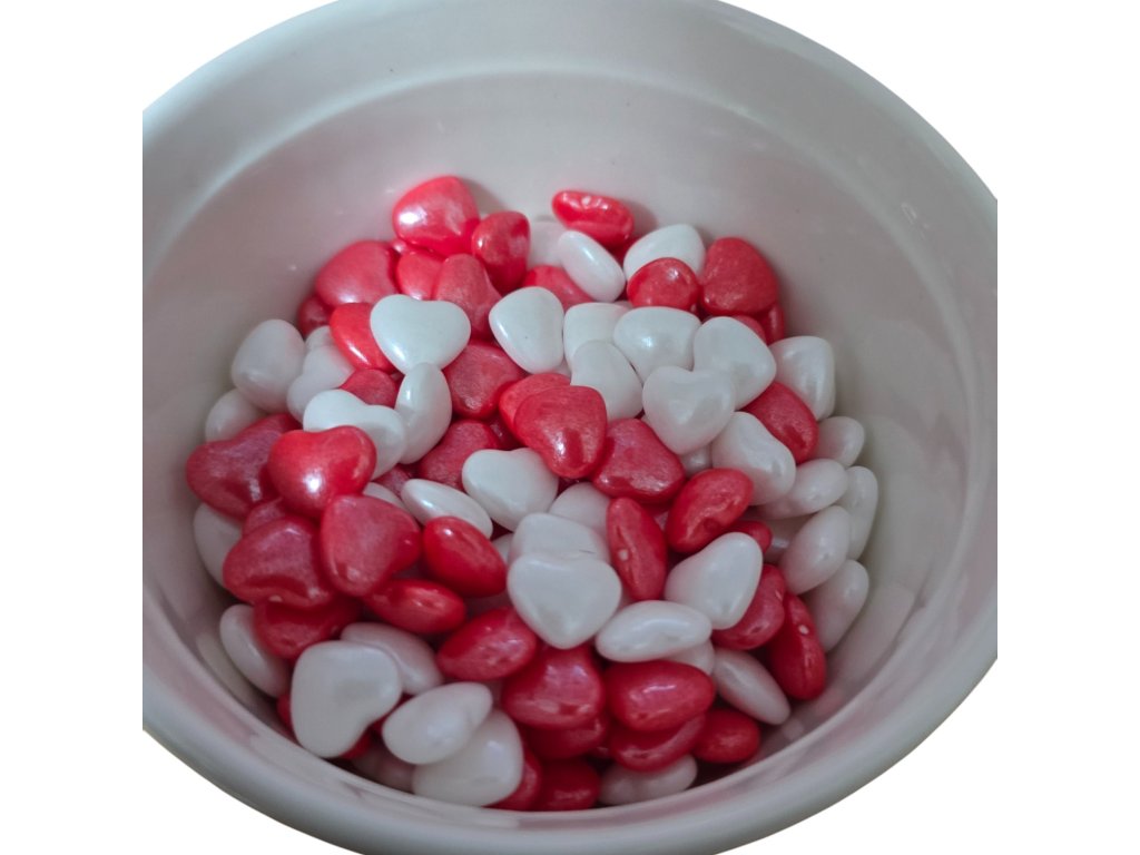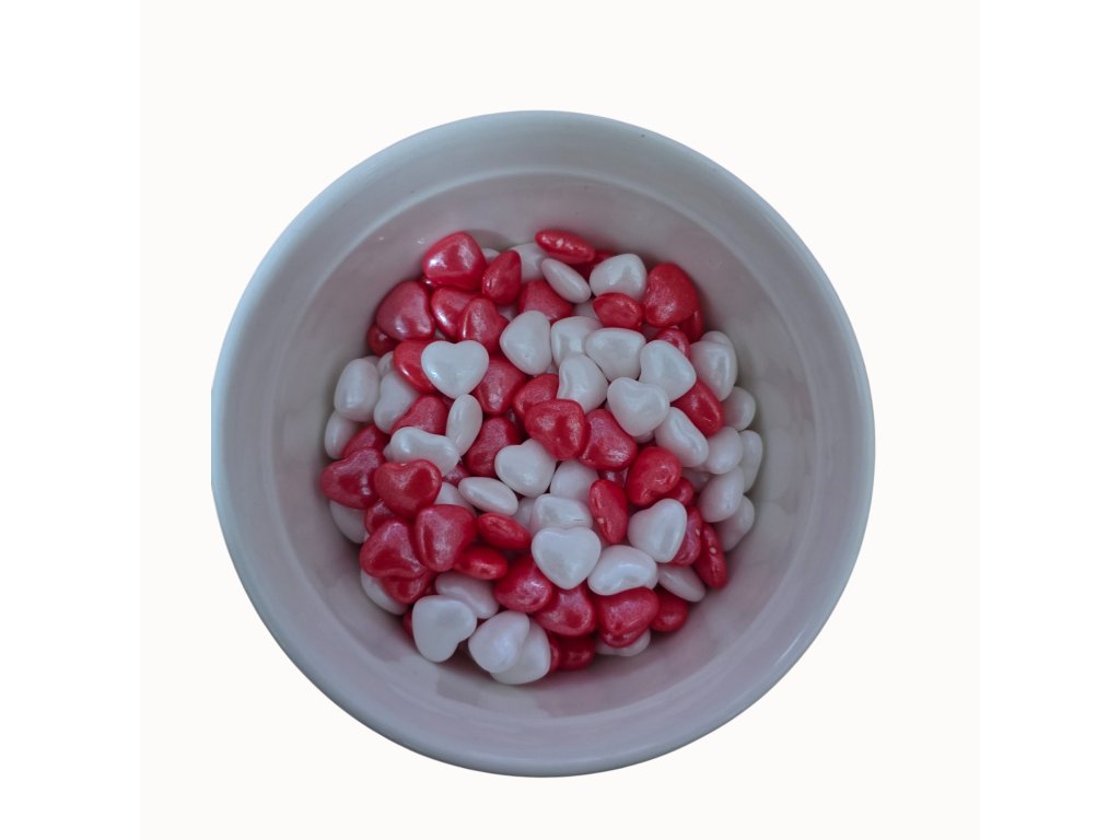 Romantický mix červených a bílých cukrových srdíček s jemným leskem promění každý dort v láskyplné vyznání. Díky své velikosti krásně vyniknou jako hlavní dekorace – nejen jako posyp.