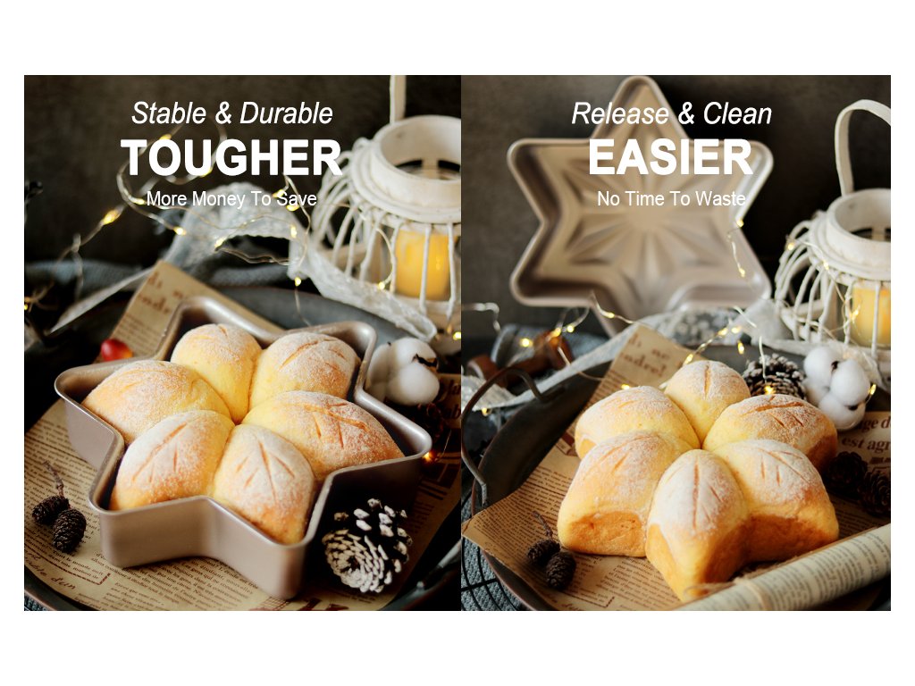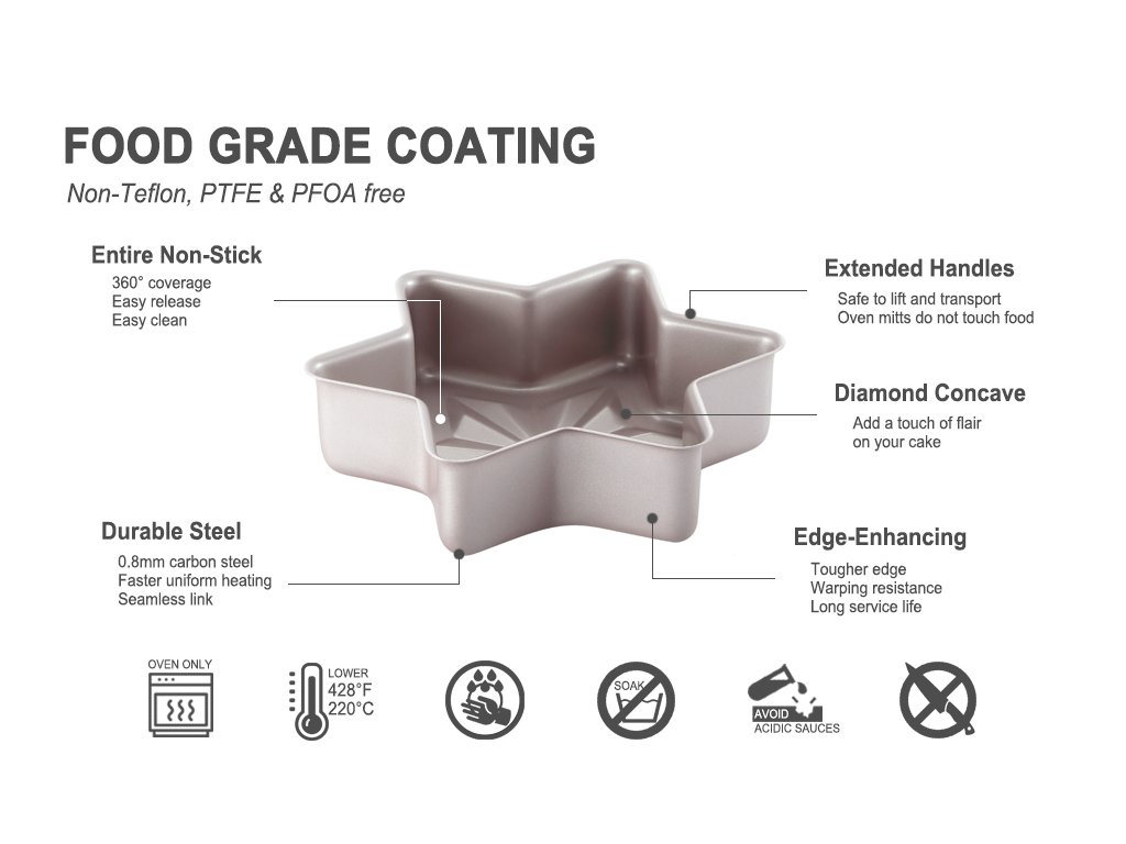 Speciální potravinářský silikon (Food-Grade Silicone) je zcela bez teflonu, PTFE, PFOA i olova. Forma umožňuje pečení s minimem tuku a snadné vyklopení hotového dezertu.