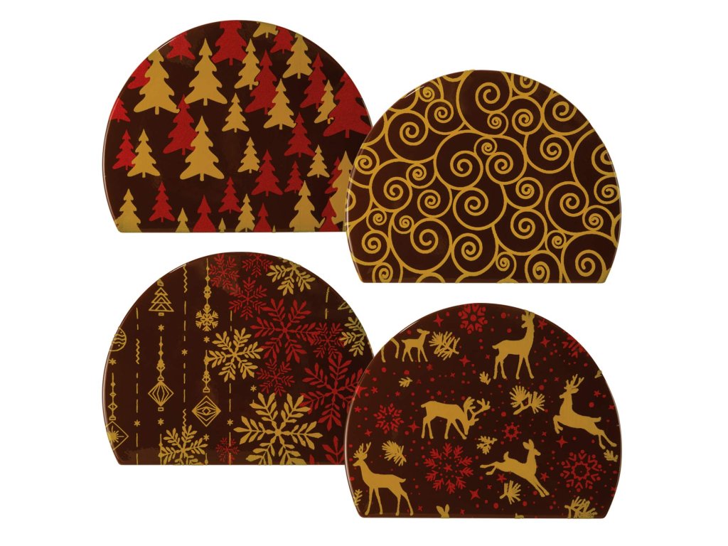 Tyto prémiové půlkruhové konce z hořké čokolády mají krásný vánoční potisk v červené, zlaté a hnědé. Vypadají luxusně, slavnostně a dodají dezertu realističnost – jako by šlo o skutečný kmen dřeva, jen mnohem chutnější.