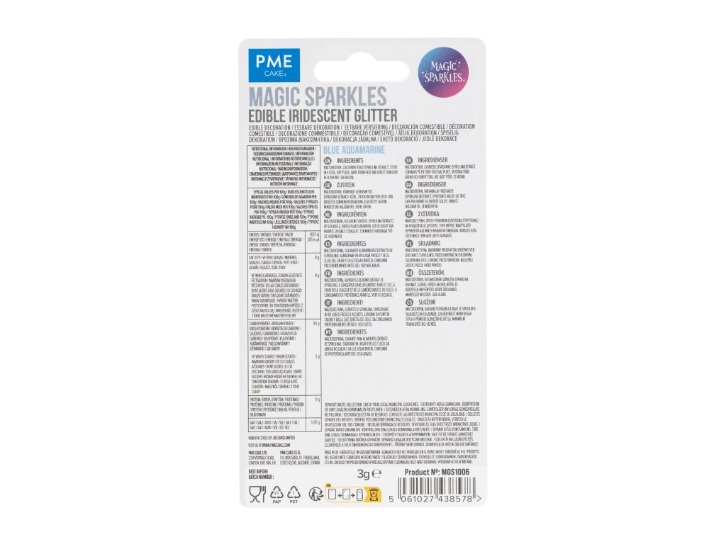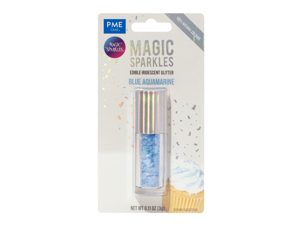 Kouzelné třpytky (Magic Sparkles) v edici Modrý akvamarín jsou nepostradatelným doplňkem pro každého cukráře. Tento odstín je inspirován barvou průzračného akvamarínu a dodává dezertům okamžitý nádech luxusu. Na rozdíl od běžného sypání jsou tyto vločky extrémně tenké a lehké, což jim umožňuje zůstat na povrchu krému bez promaštění nebo potopení.