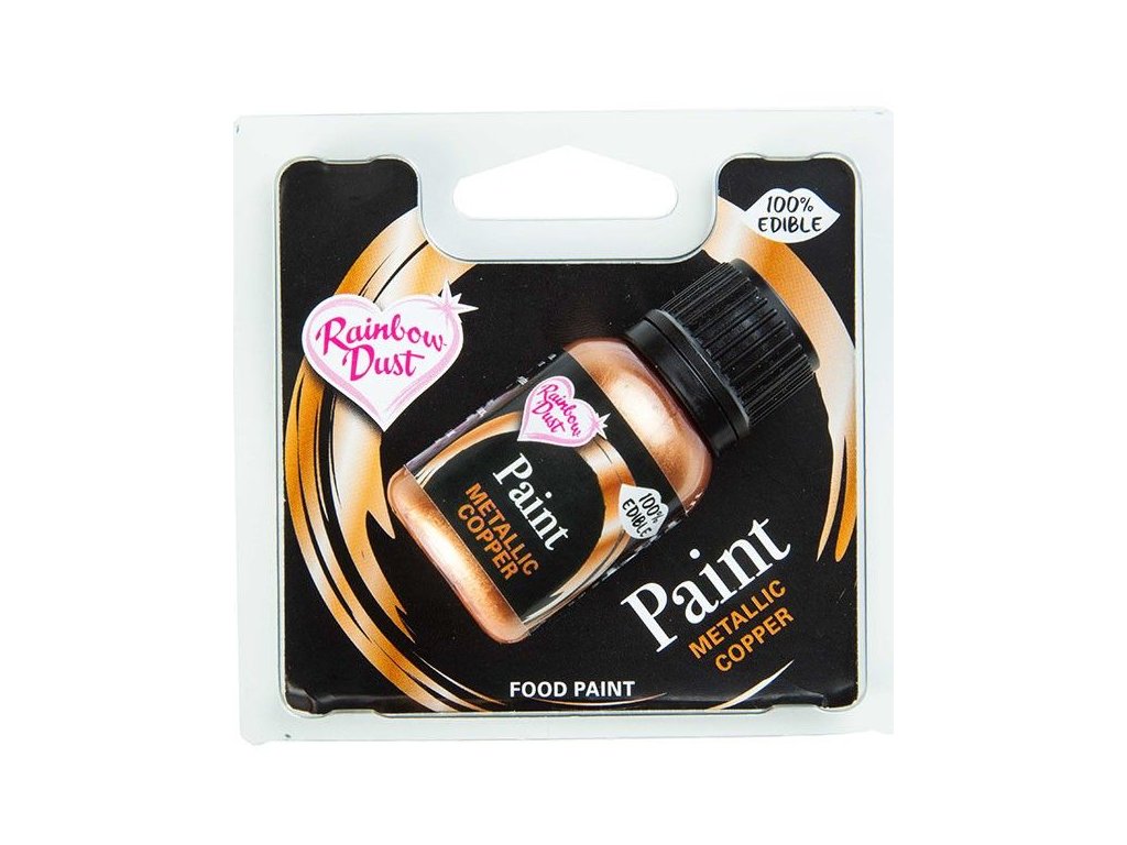 Informace o produktu "Rainbow Dust Metallic Food Paint Copper 25ml"Dejte fondantu, marcipánu a podobným produktům obzvláště krásné barevné efekty s barvami Rainbow Dust Food Paints. Barva se snadno používá: Před použitím protřepejte a poté aplikujte štětcem přímo na svůj výtvor. Poté stačí štětec opláchnout vodou.