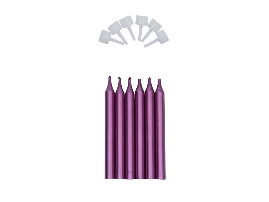 Metalické růžovo-fialové svíčky na dort s držáky | 6 ks, 9 cm