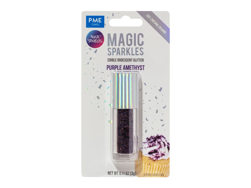 Dodáš svým dezertům luxusní a magický vzhled s jedlým třpytem PME Magic Sparkles – Purple Amethyst. Tento jedlý glitter má výrazný ametystově fialový, duhový prismatic efekt, který promění každý zákusek v třpytivý šperk.