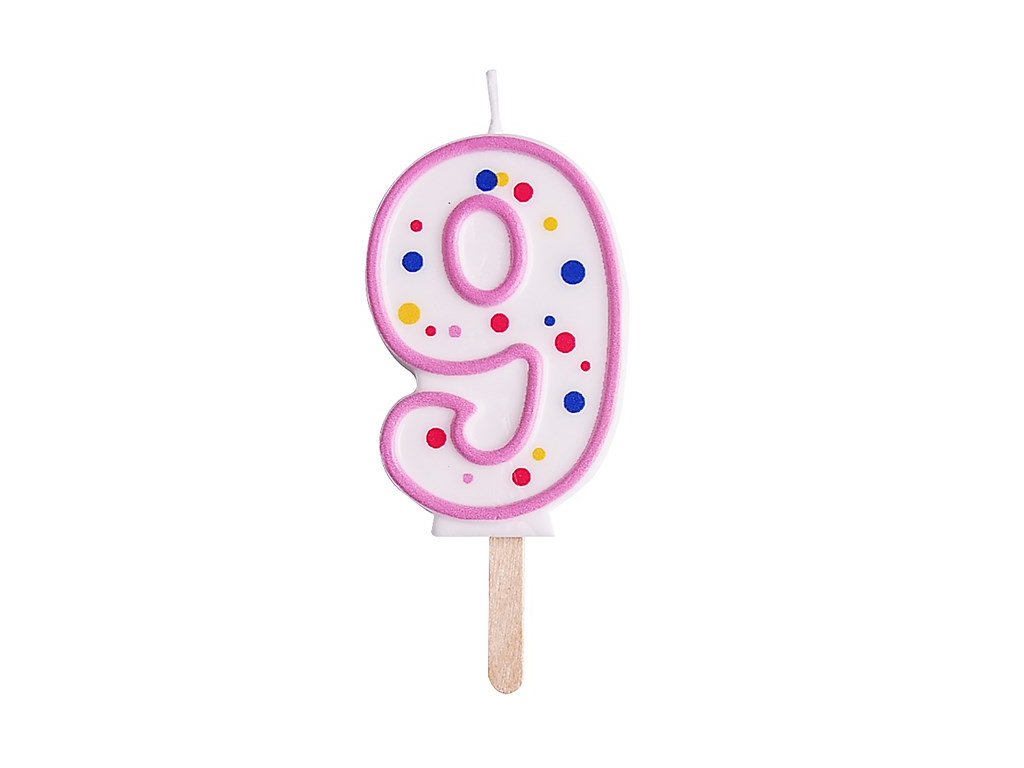 Růžová číslicová svíčka PME 9 ozdobená barevnými puntíky je perfektním doplňkem pro každou oslavu. Skvěle se hodí na narozeniny, výročí, dětské párty nebo kombinaci s dalšími čísly.