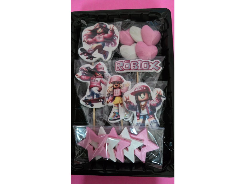 Veselá a barevná sada jedlých dekorací ve stylu oblíbené hry Roblox, ideální pro holčičí narozeninové dorty, cupcakes nebo sweet bar. Set kombinuje větší toppery na špejli, malé postavičky a nápis, růžovo-bílé srdíčkové dekorace a lehké hvězdičky z cukrové hmoty.