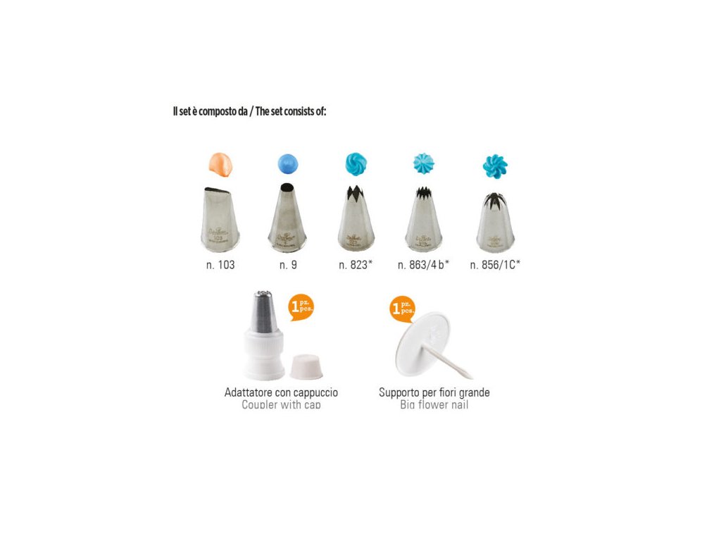 sada obsahuje 7 kusů: adaptér s víčkem, držák na květiny a 5 zdobicích trysek