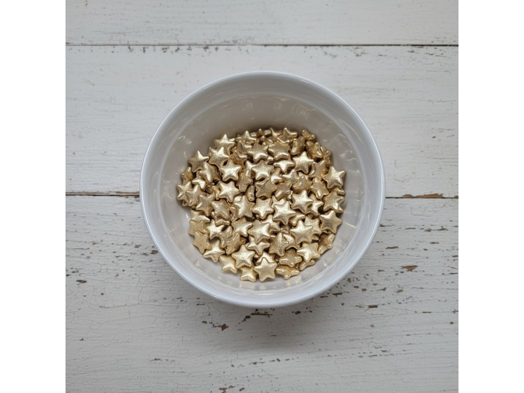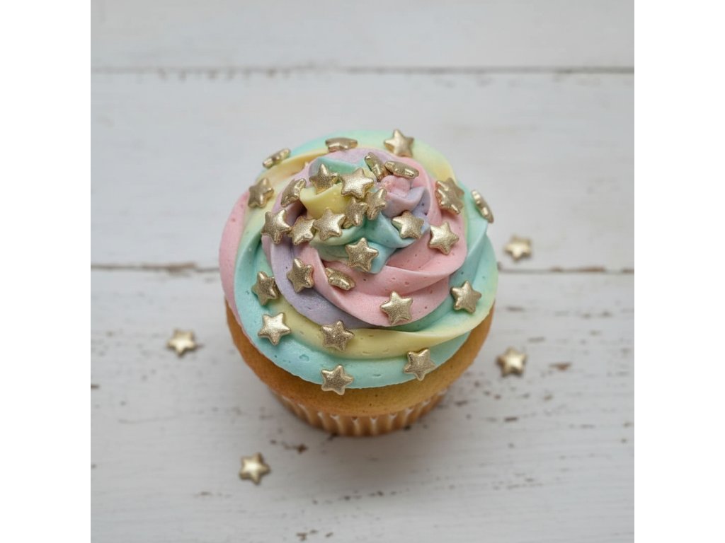 Zlaté hvězdičky krásně vyniknou na bílém máslovém krému, tmavé čokoládě nebo pastelových polevách. Pro extra efekt je kombinuj s jemnými perličkami nebo bílým zdobením ✨