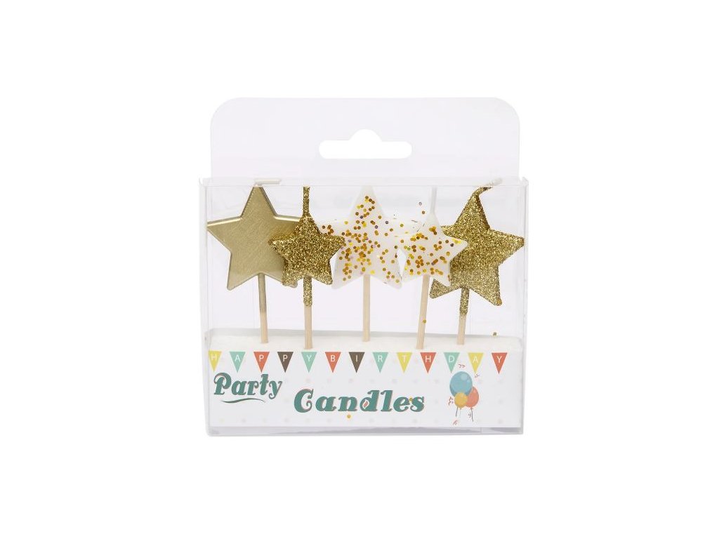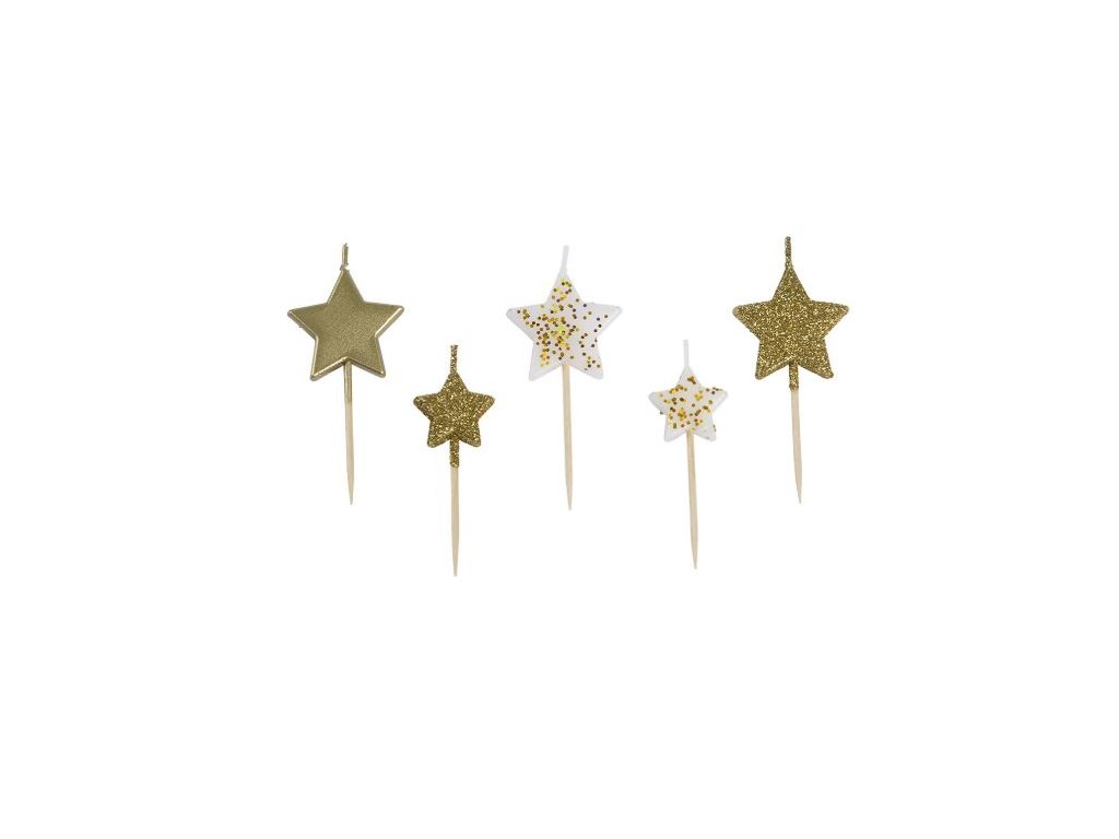 Zlaté dortové svíčky Hvězdy s glitry | 5 ks, mix velikostí